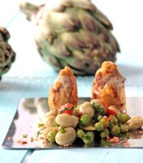 Una vez fritas las alcachofas rebozadas, las sacamos de la sartén y las introducimos en la cazuela con las habas y guisantes cocidos, damos un hervor al conjunto de 5 minutos y servimos al momento.