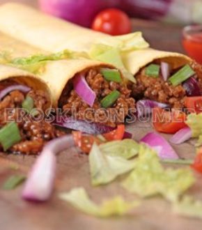 Colocamos sobre las tortillas de maíz una base de lechuga cortada en juliana, unos trocitos de de queso cremoso y unas cucharadas de carne picante. Terminamos acompañando de unos trocitos de tomate cherry y unas tiras de cebolleta morada, enrollamos la tortita y ya está todo listo para comer los burritos de carne en salsa picante. Si se quiere, se pueden hornear para que quede crujiente la tortita y se funda el queso por dentro.