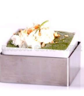 Pasamos por la batidora la crema de espinaca junto con un chorrito de leche, colamos esta crema por un colador chino (colador cónico), para que nos quede una textura lo más fina posible, volvemos a poner en la cazuela limpia al fuego moderado y damos el punto de sal. En el momento de servir acompañamos de queso crema (una cucharada por persona) con unos anacardos troceados y ligeramente tostados, a modo de divertido acompañamiento.