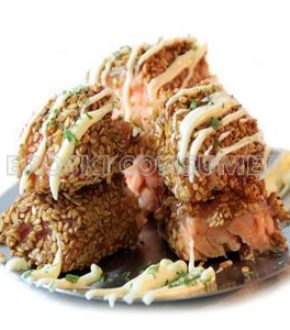Troceamos los lomos de salmón sin piel ni espinas en tiras gruesas, untamos de aceite de oliva y salsa de soja y marinamos durante 30 minutos. Escurrimos de la marinada y rebozamos con las semillas de sésamo. En un sartén antiadherente sin aceite de oliva y a temperatura alta, cocinamos por todos los lados durante 20 segundos de manera que se cocine el exterior y no el interior. Acompañamos las hojas de lechugas variadas y aliñamos con el aceite de oliva extra virgen y el vinagre de sidra y la sal. También salseamos ligeramente con unos hilos de mayonesa casera.