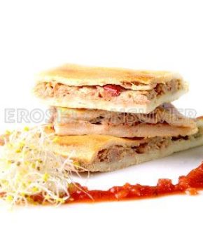 Primero elaboramos la masa siguiendo estos pasos: ponemos la harina en un bol, hacemos un agujero en el centro y mezclamos allí el agua templada, una pizca de sal y la levadura disuelta en un poco de agua templada. Mezclamos poco a poco con una espátula y, una vez que comience a separarse de las paredes del bol, agregamos el aceite y seguimos mezclando hasta que comience a tomar forma de bola. Entonces sacamos del bol y comenzamos a amasar con las manos sobre una superficie lisa. Amasamos hasta conseguir una masa suave, elástica y no pegajosa, añadiendo algo más de agua o harina si hiciese falta. Formamos una bola y dejamos reposar tapada durante hora antes de usarla.