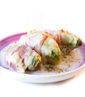 Enrollamos el jamón de york en las endibias y ponemos en la bandeja del horno.
