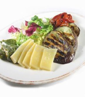 Preparamos la ensalada con las hojas ligeramente aliñadas con la vinagreta de frambuesa y montamos el resto de los ingredientes rematando con las láminas de queso manchego.