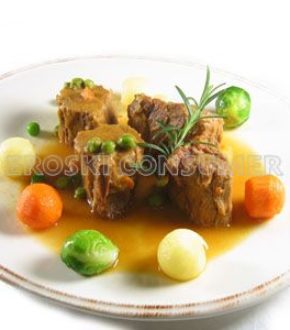 Servimos el estofado de carne acompañado de unas zanahorias, coles de Bruselas y patatas cocidas en agua hirviendo y salteadas en una sartén a fuego fuerte.