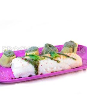 Acompañamos los lomos de merluza con las alcachofas al pesto.