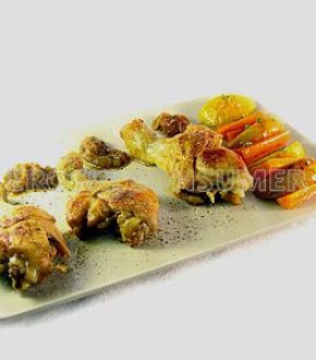 Servimos los muslos de pollo con la guarnición de manzana y zanahoria.