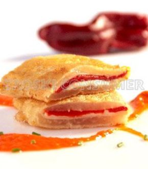 Cuando las pencas estén frías, las preparamos como si fuera un bocadillo: encima de cada trozo de penca colocamos un trozo igual de queso, uno de jamón, una lámina de pimiento del piquillo escurrido de la conserva y tapamos con otro de penca. Rebozamos con harina y huevo y freímos en aceite caliente. Una vez fritas, las sacamos a una bandeja o a un plato con papel de cocina para que la grasa de la fritura se elimine.