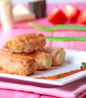Enrollamos cada trozo de puerro en una loncha de jamón york y rebozamos pasando los trozos de puerro por harina y luego por huevo. Freímos en el aceite bien caliente hasta que se doren. Escurrimos sobre papel absorbente. Servimos acompañados de una salsa española o una salsa atomatada de verduras. También quedan muy ricos con una salsa verde.