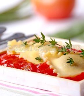 En este caso, los vamos a cocinar en agua hirviendo suave con un poco de sal durante 8 minutos o hasta que comprobemos que la pasta está cocida. Sacamos los raviolis del agua de cocción, los escurrimos y preparamos la salsa con la que vamos a acompañar. Hacemos una salsa de tomate casera con unas hierbas aromáticas como orégano, albahaca y tomillo. Acompañamos los raviolis cocidos con esta salsa, sirviendo inmediatamente.