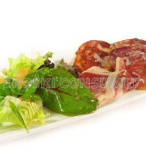 Acompañando la ensalada distribuimos de forma aleatoria los embutidos loncheados a temperatura ambiente.