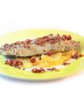 Una vez asada la ventresca, servimos todo el conjunto en el centro de la mesa con las patatas como guarnición.