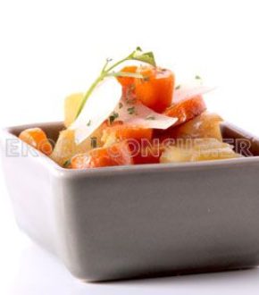 La zanahoria es un alimento con un destacado contenido en vitamina A. Es, además, fuente de hierro, proteínas, carbohidratos, calcio, fibra, potasio, yodo, magnesio, sodio y vitaminas B7, B9, C y K. En esta receta, las zanahorias se preparan con patata, lo que supone un aporte de proteínas, calcio, hierro, fibra, carbohidratos, yodo, magnesio, sodio, fósforo y vitaminas B3, B9, C y K. La cebolla suma al plato importantes cantidades de calcio, magnesio, yodo, fósforo y vitaminas A, B7, B9 y C. Es una receta poco calórica, aunque con un destacado contenido en grasa, por lo que debe moderarse su consumo.
