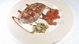 Filete de avestruz con salsa de champiñón y pimientos asados