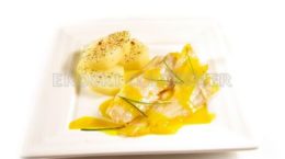 Lenguado a la plancha con rodajas de zanahoria y calabacín en su jugo