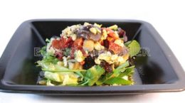 Ensalada templada con rehogado de cebolla, pimiento rojo y setas variadas
