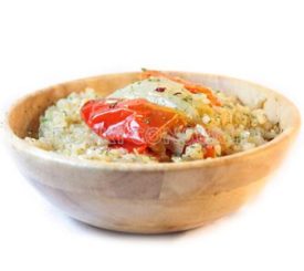 Arroz integral con rehogado de puerros, calabaza y pimientos rojos