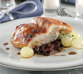 Cochinillo tostado con guarnición de cebolla morada y uvas moscatel