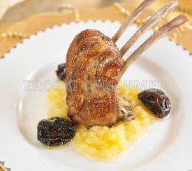 Costillar de cordero asado con manzana reineta y ciruelas pasas con salsa agridulce