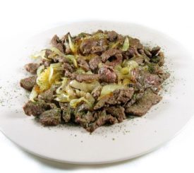 Solomillo de cerdo con fritada de pimiento y cebolla
