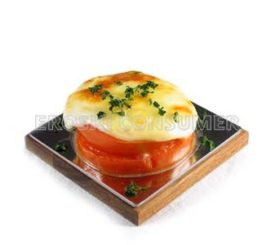 Rodajas de tomate con queso fresco y queso graso gratinado